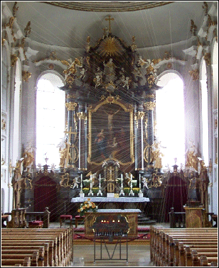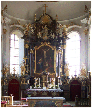 im Schiff ist die Szenerie der Glorie des Pfrontener Kirchenheiligen St.