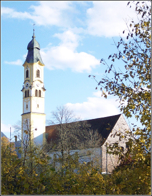 Über das dunkle Schindeldach erhebt sich seit 1749 der neue 61 m hohe